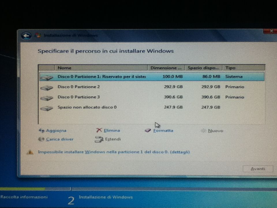 salve a tutti, sto per installare w7 pro sp1 64 bit sul mio nuovo pc, ho un hdd da 1tb, io vorrei creare 3 partizioni: una da 300gb per il so (C), una da 400 per i programmi (D) ed il restante per storaggio (E). quando arrivo alla schermata in cui posso creare la partizioni ho uno spazio non allocato disco 0 di 931.5gb, lo evidenzio e clicco su nuovo per creare una partizione da 300gb per w7 e mi da questo messaggio: per garantire il corretto funzionamento di tutte le funzionalità di windows è possibile che vengano create altre partizioni aggiuntive per i file di sistema" ed insieme al disco 0 partizione 2 da 292.9gb (tipo primario) mi crea un'altra partizione da 100mb chiamata disco 0 partizione 1: riservata per il sistema (tipo sistema) poi clicco su spazio allocato disco 0 per creare l'ultima partizione, alla fine mi ritrovo con 4 partizioni: