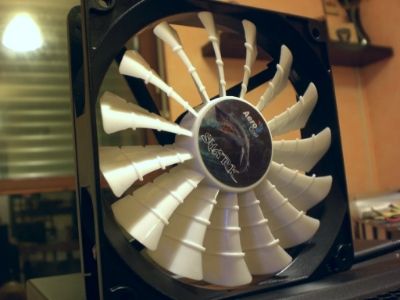 il corpo ventola e stao a tutte e 4 dipinto di nero ,molto piu belle e piu silenziose ,il contrasto nero e bianco con i led anch essi bianchi fa un effetto non da poco ,tutte le ventole son sleevate con guaina MDPC nera e pin neri